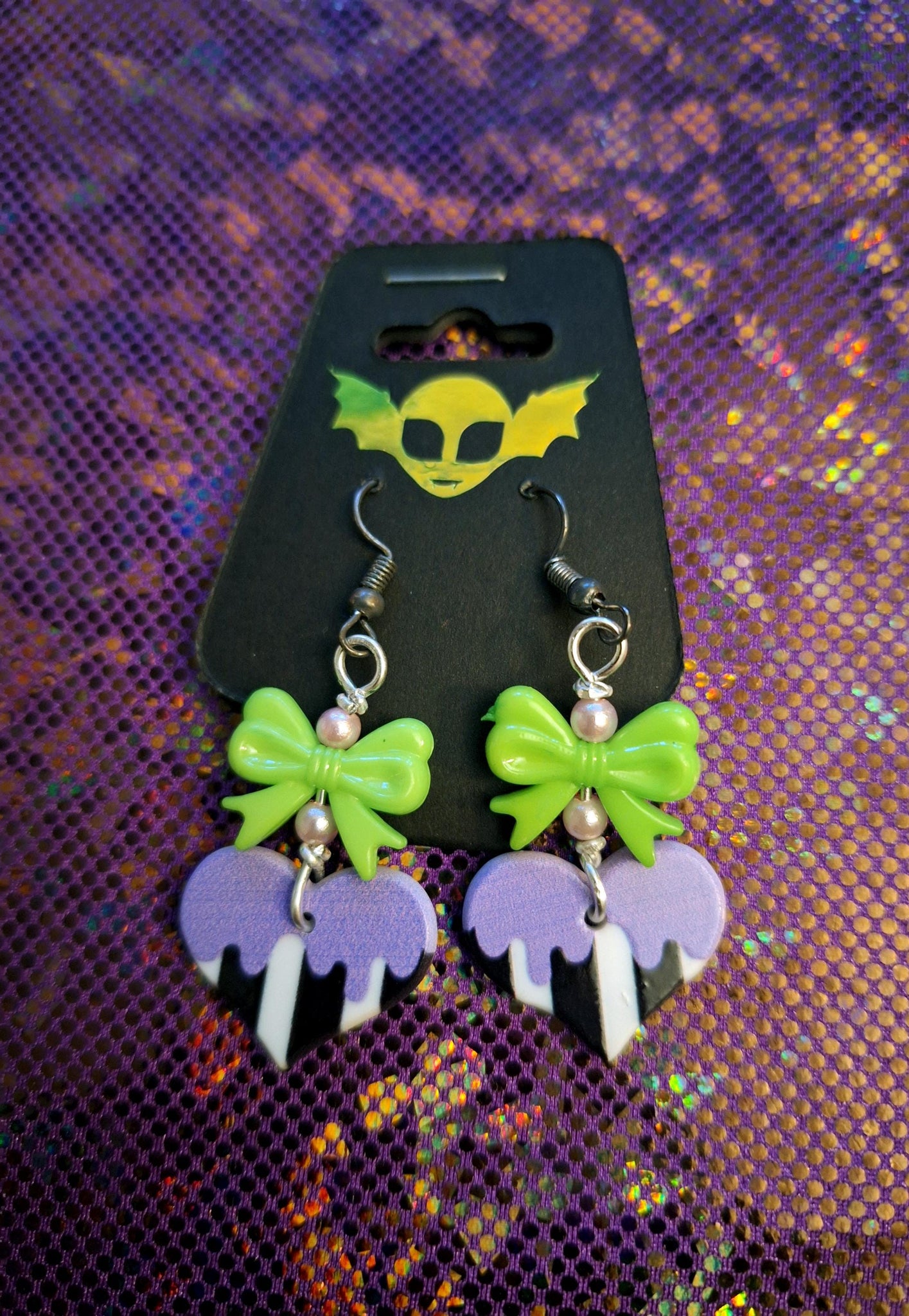 Spooky slime heart earrings in your choice of green slime with magenta bow or purple slime with green bow. Lightweight. Attaches with silver ear wire.